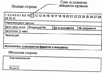 Форма карточки (РКК — регистрационно-контрольной карточки) и расположение в ней реквизитов могут быть определены в самом учреждении и записаны в инструкцию по делопроизводству.