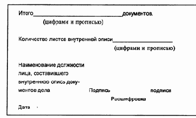 Внутренняя опись помещается в начале дела, и в нее вписываются данные о каждом подшиваемом документе. По окончании формирования дела составляется итоговая запись внутренней описи с указанием количества включенных в нее документов и количества листов самой описи: