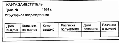 Если требуется выдать целиком все дело, заполняется карта-заместитель, в которой указываются номер выданного дела, дата выдачи, кому выдано дело, на какой срок, росписи в получении и приеме после возвращения документов.